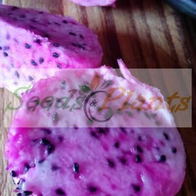 Dragon Fruit Purple Seeds. This particular Dragon Fruit has a pinkish purple flesh. Dragon fruit, also known as pitahaya or pitaya, belongs to the cactus family. It grows on the Hylocereus cactus, also known as the Honolulu queen, whose flowers only open at night. It’s a climbing cactus and needs support for growing. The flowers are unique, and one among the largest in the world with a diameter of 25 cm and is about 30 cm long.